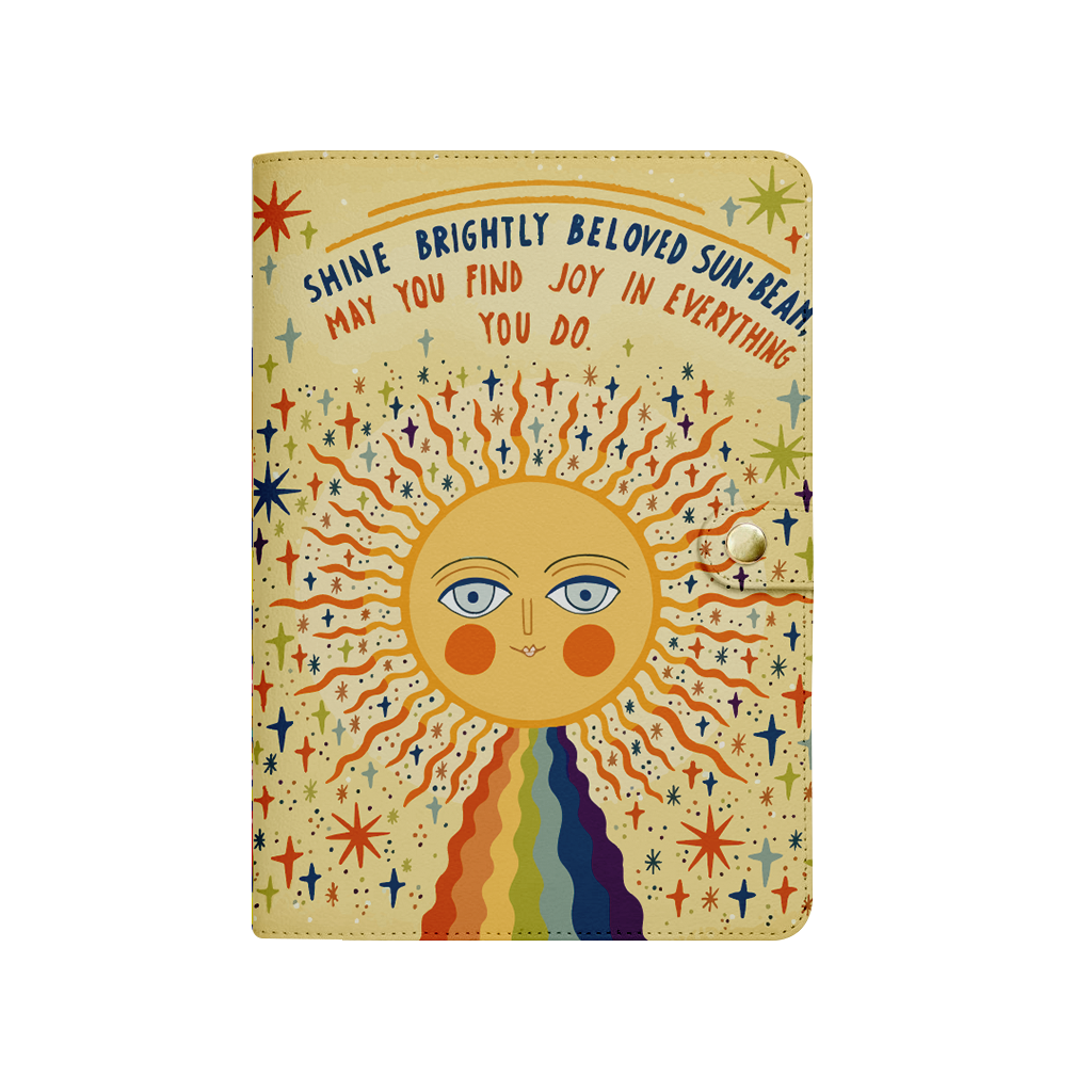 Imprimé vintage motifs stylisés soleil géant, étoiles et arc-en-ciel en rayons diffus vers le bas coloris tendrement pastel. Nouvelle Collection Duo Accessories x Sabrine Summer 24.