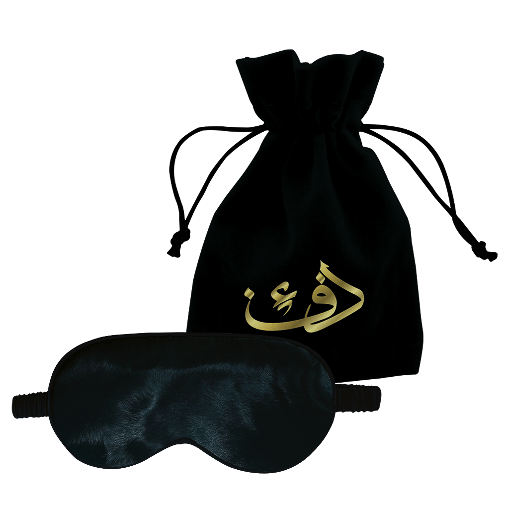 Motif mot “دفء” calligraphié en arabe doré sur fond noir en faux fourrure. En déplacement ou chez soi, un masque cache yeux pratique, livré avec une pochette de protection assortie.