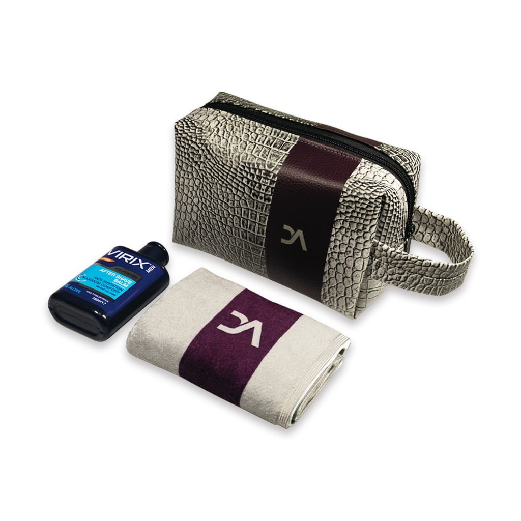 Une belle trousse sobre et raffinée dans un gris majestueux et profond, imprimé motif texture serpent. Composée par une serviette ultra douce et absorbante ainsi qu’un baume après rasage de la marque Virix MEN, elle est parfaite pour une hygiène masculine au top. Spéciale Saint Valentin, une trousse cadeau idéale pour les amoureux.