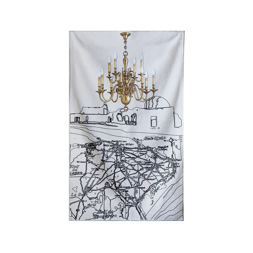 Nouvelle Collection. Imprimé illustration stylisée motifs Houch typique et trame de l’île de Djerba en Cartographie avec lustre suspendu. Des scènes délicatement reproduites pour un plaid doux, délicat et cocooning. En jetée de canapé ou pour s’y lover les soirées d’hiver, un accessoire chic et chaleureux.