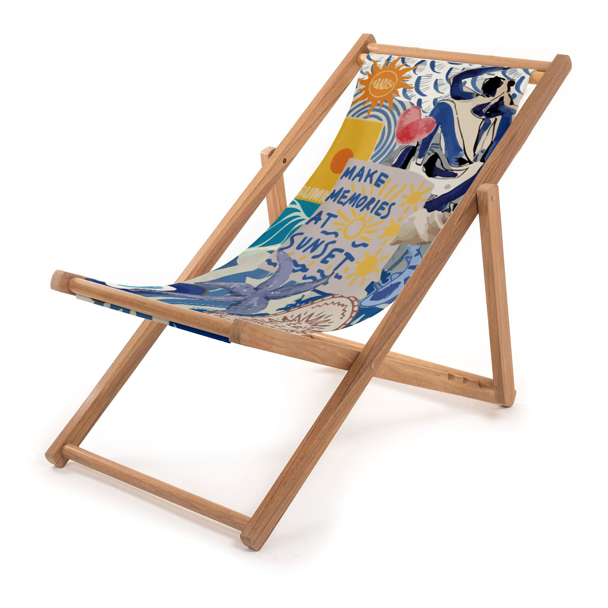 Imprimé motifs coquillages, soleil, vagues et texte en patchwork ultra frais dominante blanc, bleu et jaune. Un transat, modèle moyen, tout aussi fonctionnel et pratique que son aîné ; pour s’y installer confortablement et profiter du moment, à l’intérieur ou à l’extérieur.